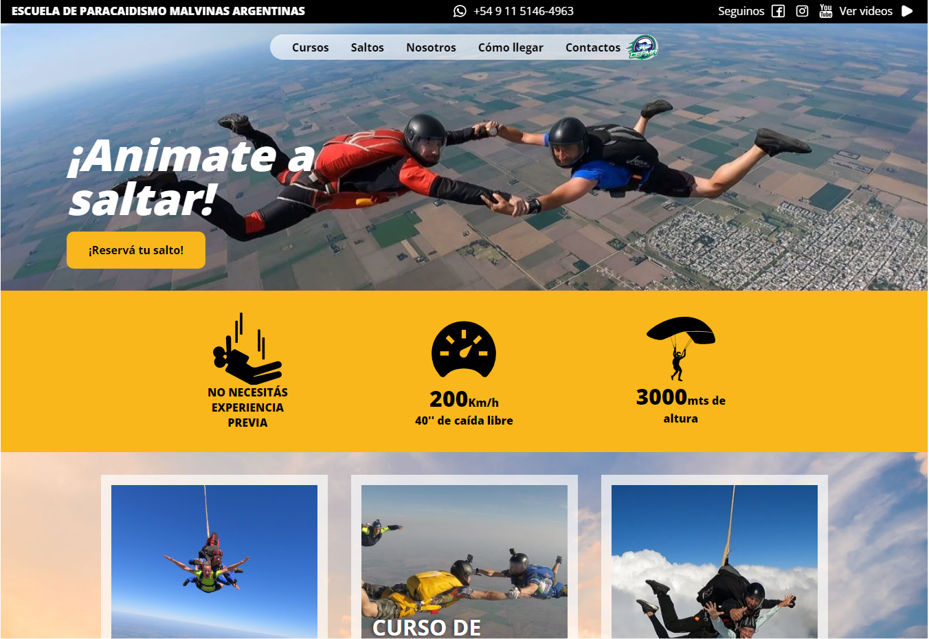 Tras escuchar el pedido e investigar el rubro, se le entregó al cliente una página web institucional, adaptable a todas las pantallas, que informa de todos sus servicios, muestra fotos de la escuela y tiene datos relevantes para la contratación de su servicio. A su vez “salto de bautismo”, “curso de paracaidista” y “curso de piloto” llevan a sus propias landings page con el objetivo de poder publicitarlas por separado.